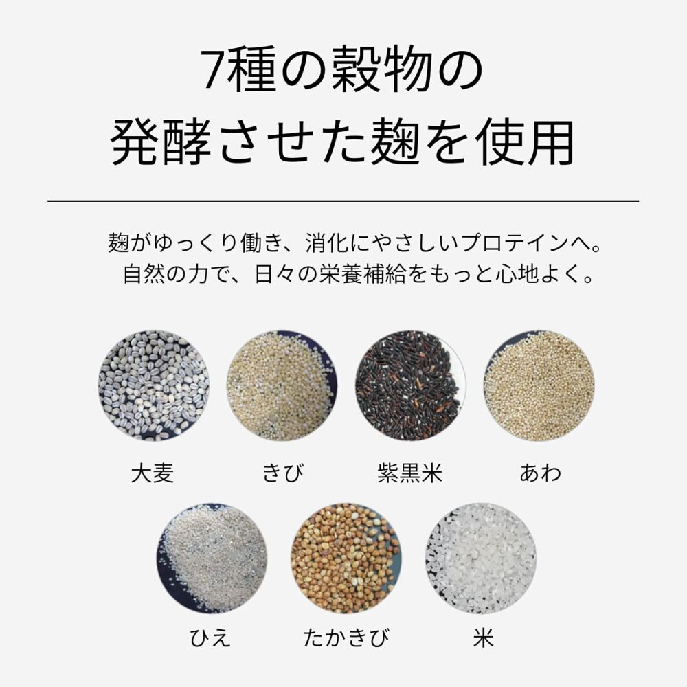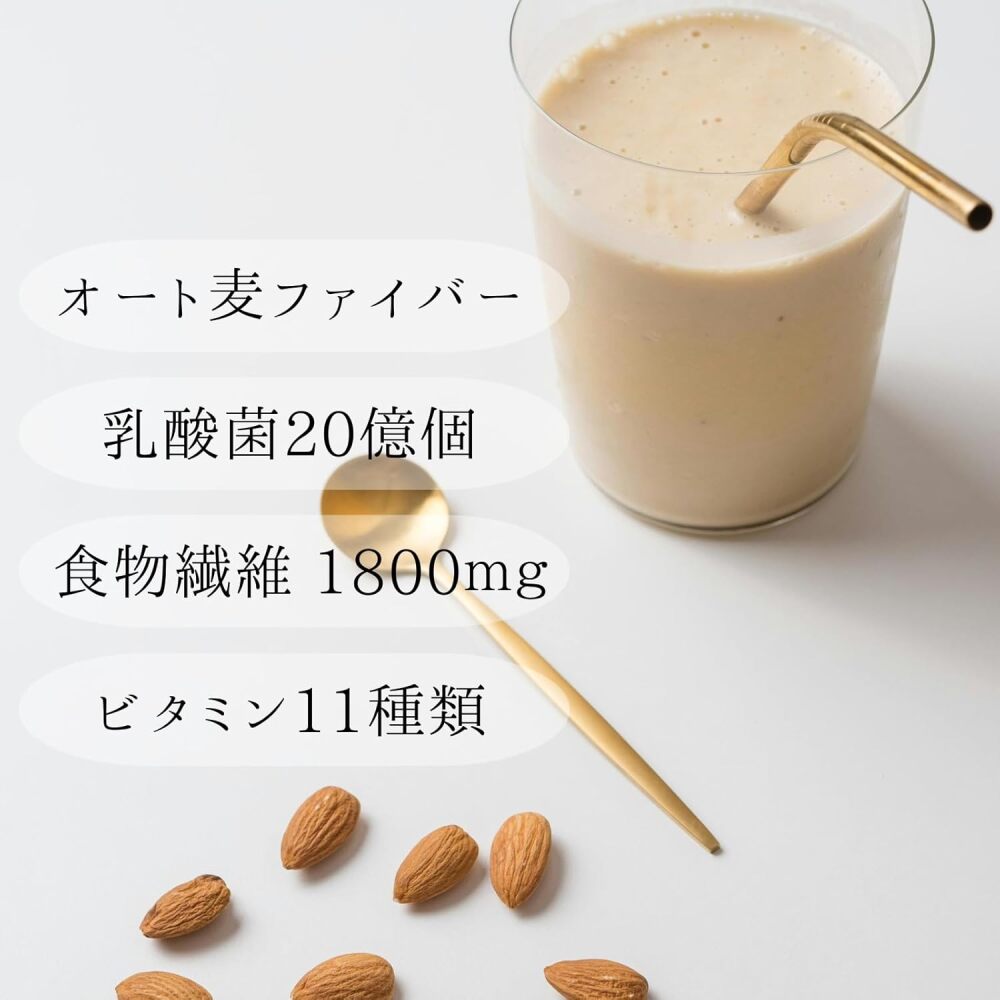 大豆たんぱく(アメリカ製造)、エンドウたんぱく、オート麦ファイバー、植物油脂、食塩、アーモンドパウダー、豆乳パウダー、穀物麹(大麦、あわ、ひえ、きび、タカキビ、紫黒米、米)、米麹、植物性乳酸菌(殺菌)/レシチン、増粘剤(グァーガム)、乳化剤、V.C、甘味料(ステビア)、V.E、ナイアシン、パントテン酸Ca、V.B1、V.B6、V.B2、V.A、葉酸、香料、V.D、V.B12
