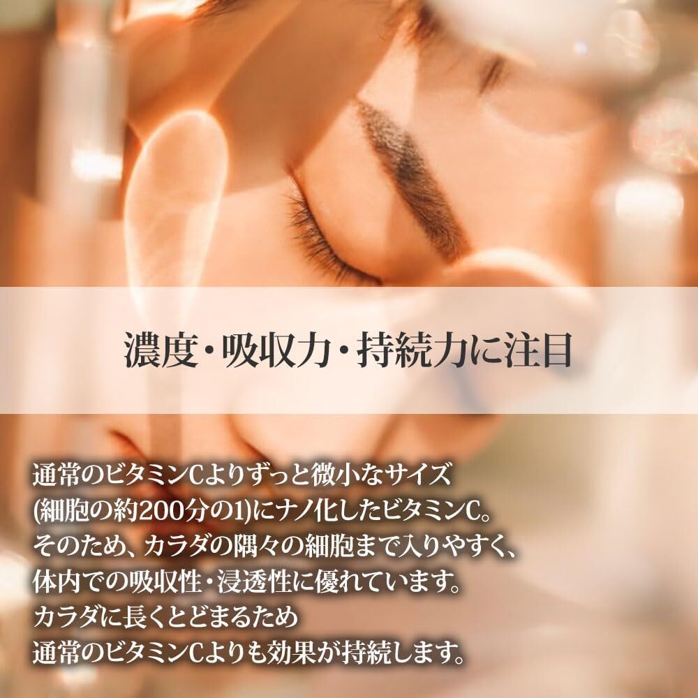 通常のビタミンCよりずっと微小なサイズ(細胞の約200分の1)にナノ化したビタミンC。そのため、カラダの隅々の細胞まで入りやすく、体内での吸収性・浸透性に優れています。カラダに長くとどまるため、通常のビタミンCよりも効果が持続。
