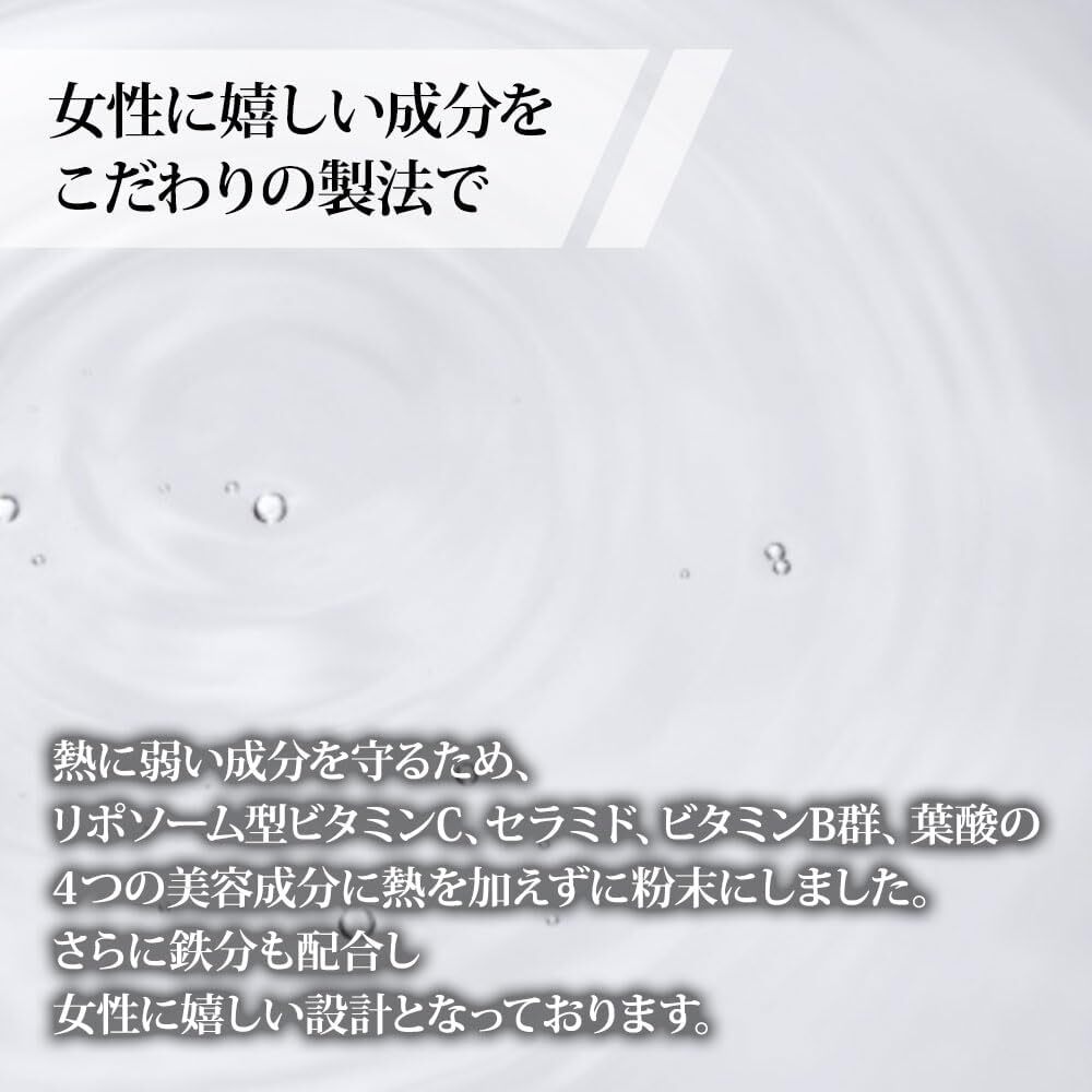 熱に弱い成分を守るため、リポソーム型ビタミンC、セラミド、ビタミンB群、葉酸の4つの美容成分に熱を加えずに粉末にしました。さらに鉄分も配合し女性に嬉しい設計となっております。