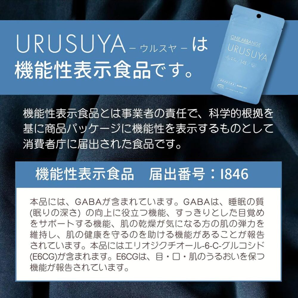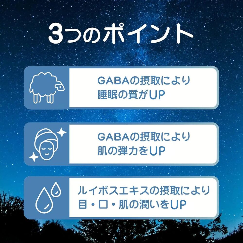 届出文言: 本品にはGABAが含まれています。GABAは睡眠の質(眠りの深さ)の工場に役立つ機能、すっきりとした目覚めをサポートする機能、肌の乾燥が気になる方の肌の弾力を維持し、肌の健康を守るのを助ける機能があることが報告されています。本品にはエリオジクチオール-6-C-グルコシド(E6CG)が含まれます。E6CGは、目・口・肌のうるおいを保つ機能が報告されています。