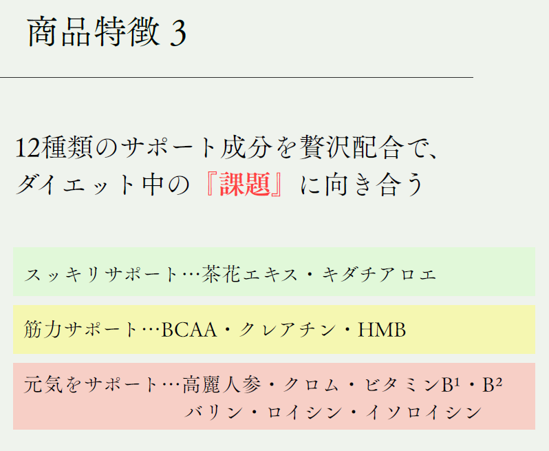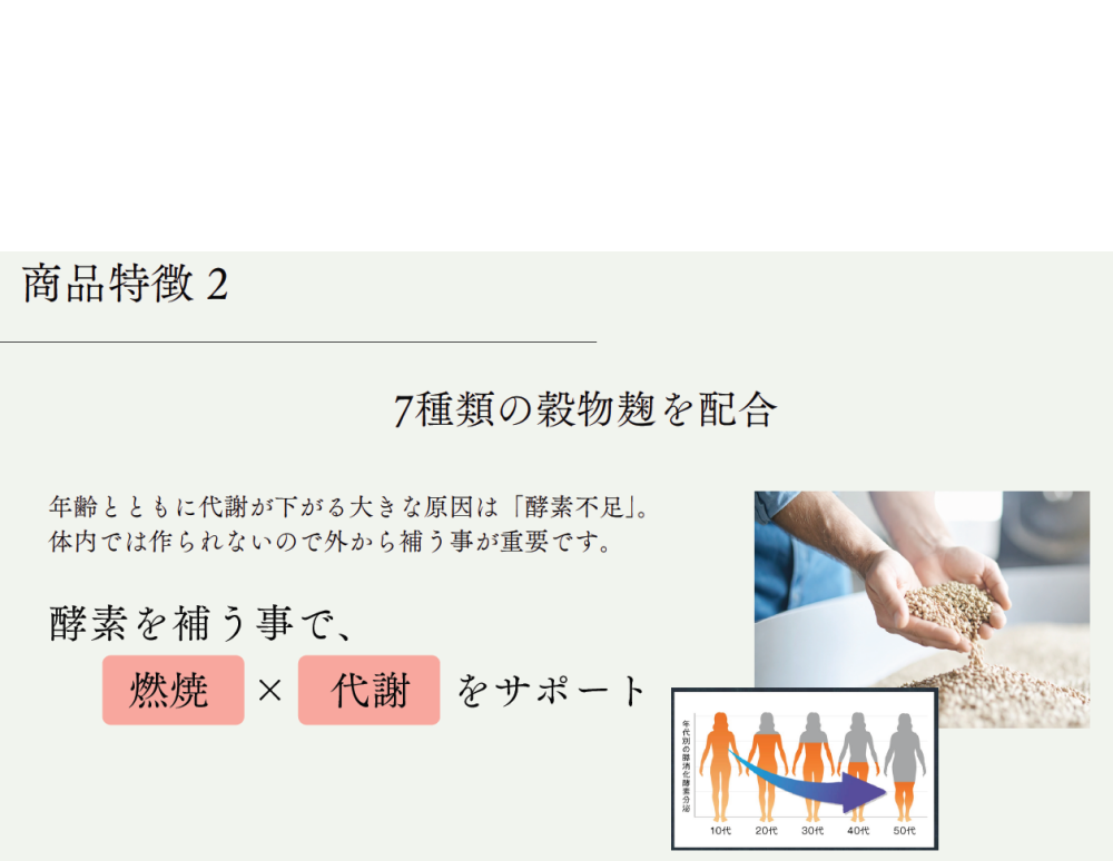 脂肪燃焼や血糖サポートをするアルロースをメインに、年齢とともに減少する酵素他、HMB、BCAAなども配合しています。